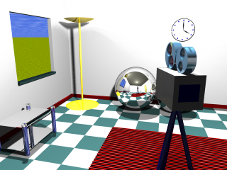 The default angle used by XSight RT is 60 degrees. If you use a smaller angle, the effect is similar to zooming in the scene, since the number of pixels in the output image remains unchanged. You can use any value for the angle between 0 and 180. As the angle approaches 180 degrees, the projection degenerates. This animated sequence was rendered from the same fixed scene, just changing the angle of the perspective camera from 180 degrees to 60 degrees: