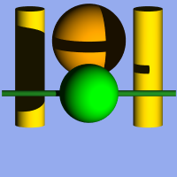 Where's the orange sphere? Since it has the same size as the green sphere, now the green sphere hides it completely. There's another interesting detail in these images. In the first image generated with the orthographic camera, the green horizontal cylinder casts a visible shadow on the rightmost yellow vertical cylinder. However, this shadow is absent in the image generated with the perspective camera. In the orthographic view, the shadow grows as it moves deeper in the scene. Of course, this also happens in the perspective view, but the perspective effect compensates the effect and the shadow is hidden by the green cylinder. In a orthographic view, visual rays are parallel, but light rays still diverges from the point source.